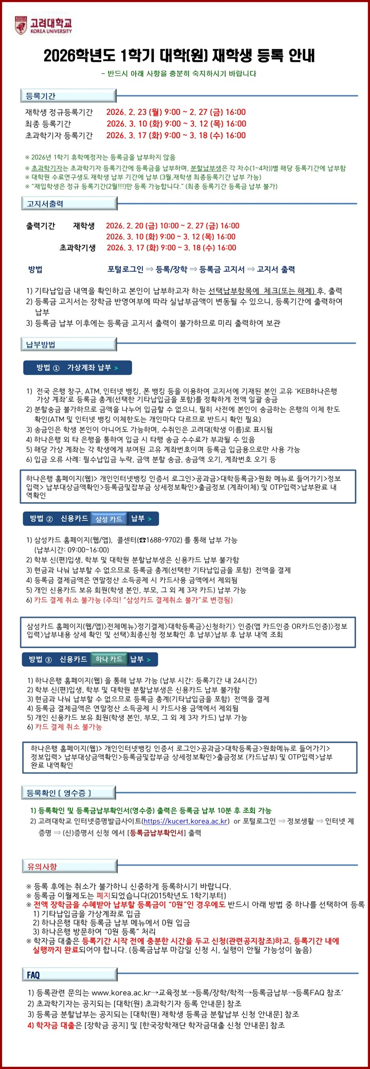2026학년도 1학기 대학(원) 등록금 수납 계획을 아래와 같이 안내 드리오니 참고하시기 바랍니다.