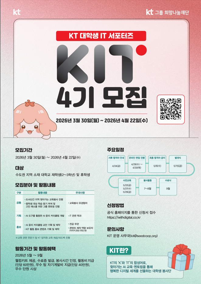 | 제목 | [KT] KT 대학생 교육 봉사 프로그램 ‘KIT 4기’ 모집 안내 |