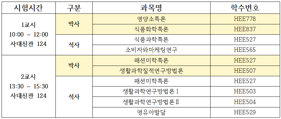2026-1학기 종합시험 (전기 / 생활과학과) 시간표 안내 드립니다.